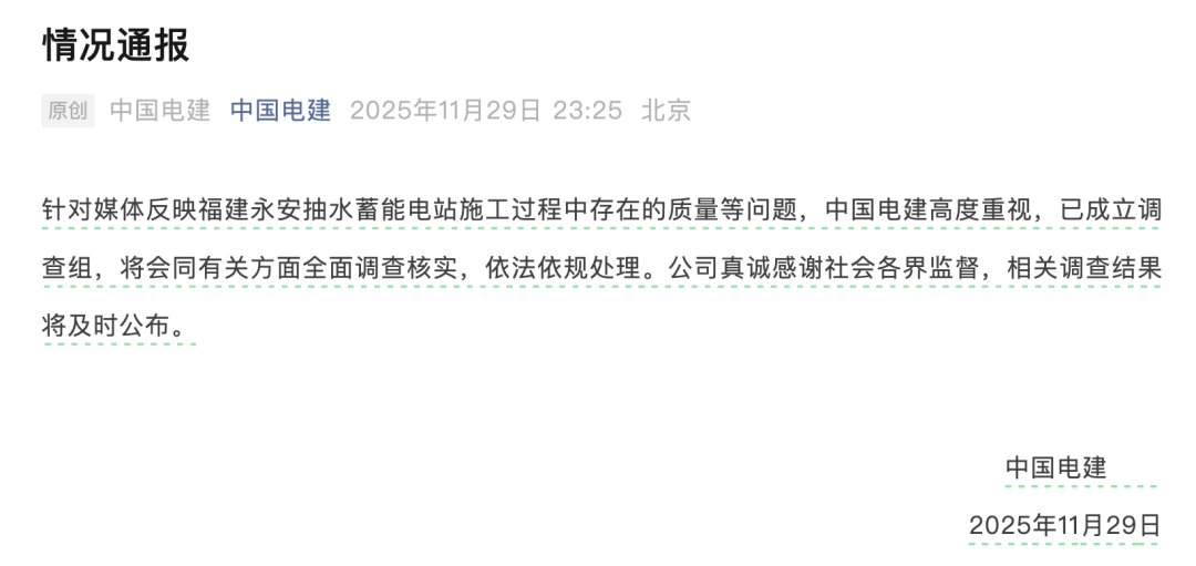 11月29日深夜,中國電建發布情況通報,針對媒體反映福建永安抽水蓄能電站施工過程中存在的質量等問題,中國電建高度重視,已成立調查組,將會同有關方面全面調查核實,依法依規處理。公司真誠感謝社會各界監督,相關調查結果將及時公布。