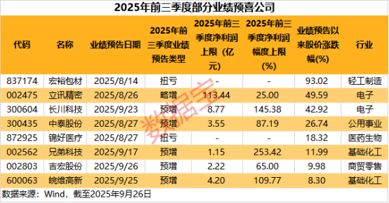 從市場表現來看,向好的業績對股價助推作用明顯。上市超過半年的8家業績預喜公司,自業績預告發布以來,股價均有上漲。宏裕包材今年前三季度業績扭虧,自2025年8月14日發布業績預告以來,股價累計漲幅超過93%;立訊精密、長川科技業績預告發布以來,股價漲幅均超過40%。